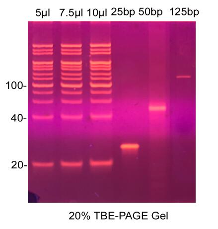本產(chǎn)品為雙鏈DNA Marker,適用于非變性的PAGE電泳和瓊脂糖凝膠電泳,不適用于尿素PAGE電泳。由于片段較小,建議使用高分辨率瓊脂糖凝膠電泳分離。按照每次上樣5μl計(jì)算,該產(chǎn)品可以使用50次。