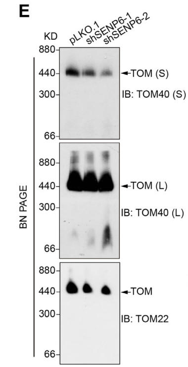 SUMO 化通過共價(jià) SUMO 結(jié)合賴氨酸殘基來動(dòng)態(tài)修飾蛋白質(zhì),由 E1 激活酶、E2 結(jié)合酶和 E3 連接酶介導(dǎo),而去 SUMO 化則由 SENPs 調(diào)控。與泛素化介導(dǎo)的降解不同,SUMO化會(huì)調(diào)節(jié)蛋白質(zhì)的活性、定位和穩(wěn)定性,從而影響基因表達(dá)、基因組完整性、細(xì)胞周期、細(xì)胞凋亡和免疫功能。最近的研究表明,SUMO化/去SUMO化參與調(diào)控線粒體的生物合成、動(dòng)力學(xué)、線粒體自噬和線粒體未折疊蛋白反應(yīng)(UPRmt)。此外,線粒體蛋白質(zhì)輸入障礙和蛋白質(zhì)穩(wěn)態(tài)受損會(huì)引發(fā)酵母中線粒體蛋白質(zhì)的SUMO化,這表明SUMO化可能也在線粒體蛋白質(zhì)輸入系統(tǒng)中發(fā)揮作用。SENP6特異性地裂解polySUMO2/3鏈,從而調(diào)控DNA修復(fù)、細(xì)胞凋亡、衰老、著絲粒組裝、炎癥、小膠質(zhì)細(xì)胞極化、血管生成和核結(jié)構(gòu)。其功能障礙與淋巴瘤、核纖層蛋白病和骨骼衰老有關(guān)。然而,SENP6 在線粒體穩(wěn)態(tài)中的作用仍未得到深入研究。
