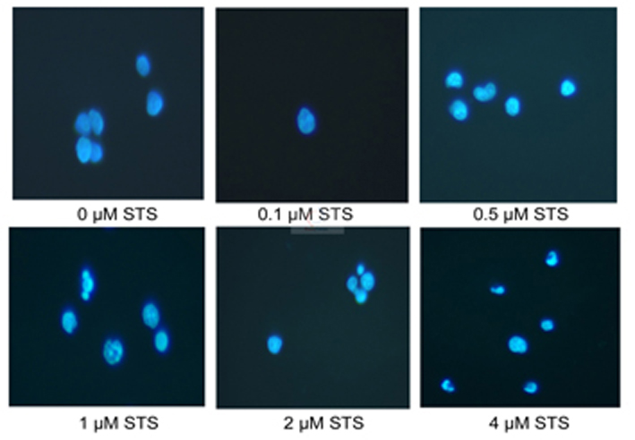ml接種于六孔板中;加入終濃度為0,0.1,0.5,1,2,4 μM STS,37℃ 5%CO2培養(yǎng)3小時;500 g 3 min收集細胞;細胞沉淀中加入1 ml固定液,常溫固定10 min;1×PBS漂洗兩次;細胞沉淀中加入0.5 ml Hoechst 33258染色液,37℃避光染色10 min;離心后細胞沉淀重懸于100 μl 1×PBS中;取5 μl細胞懸液滴于載玻片上,加5 μl 抗熒光淬滅劑,封片觀察。