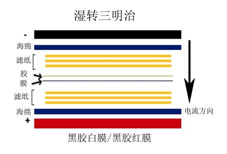 負極(電轉(zhuǎn)夾黑色面)-海綿墊-1層1 mm厚度濾紙-凝膠-膜-1層1 mm厚度濾紙-海綿墊-正