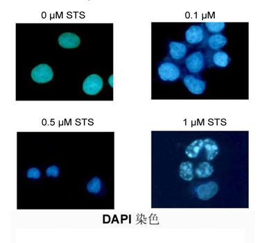 ml接種于六孔板中;加入終濃度為0,0.1,0.5,1 μM STS,37℃ 5%CO2培養(yǎng)3小時;500 g 3 min收集細(xì)胞;細(xì)胞沉淀中加入1 ml固定液,常溫固定10 min;1×PBS漂洗兩次;細(xì)胞沉淀中加入0.5 ml DAPI染色液,37℃避光染色10 min;離心后細(xì)胞沉淀重懸于100 μl 1×PBS中;取5 μl細(xì)胞懸液滴于載玻片上,加5 μl 抗熒光淬滅劑,封片觀察。