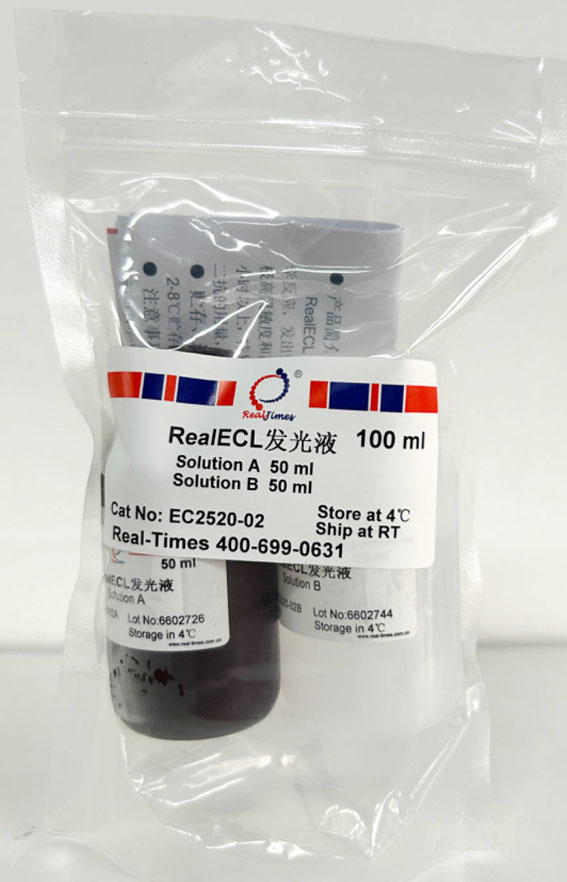 RealECL 是一種超敏ECL化學(xué)發(fā)光試劑盒,可與二抗上耦連的辣根過氧化物酶(HRP)發(fā)生化學(xué)反應(yīng),發(fā)出熒光,從而可以通過用X光片壓片或其它適當(dāng)熒光成像設(shè)備檢測樣品。RealECL具有極高靈敏度和高信噪比,可檢測出10-100 fg的微量抗原;發(fā)光迅速,熒光可使X感光膠片感光達(dá)1小時以上,特別適用于痕量蛋白檢測;另外高靈敏度可以大大節(jié)省寶貴的樣品以及非常昂貴的一抗和二抗的用量,降低實(shí)驗(yàn)成本。