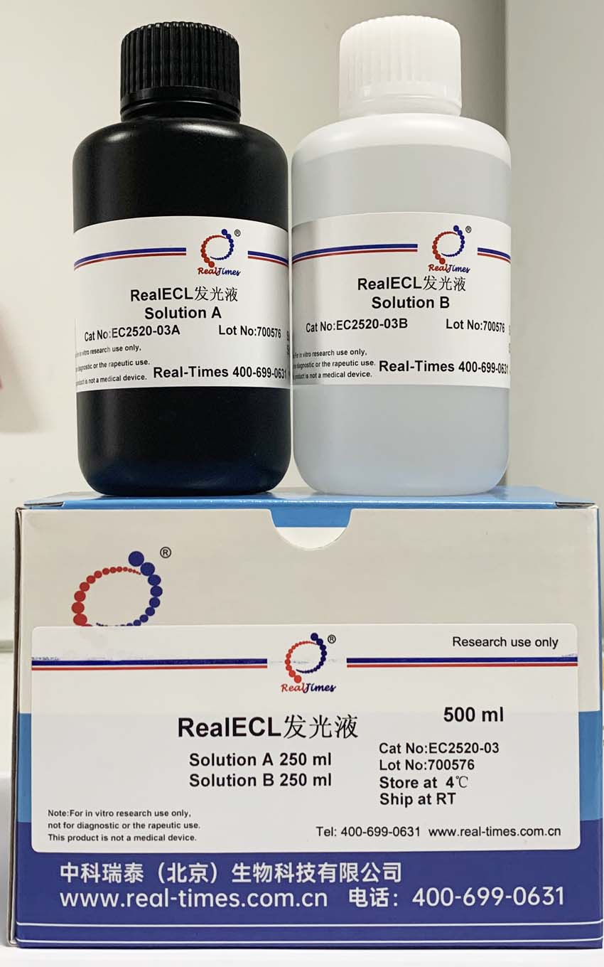 RealECL 是一種超敏ECL化學發(fā)光試劑盒,可與二抗上耦連的辣根過氧化物酶(HRP)發(fā)生化學反應,發(fā)出熒光,從而可以通過用X光片壓片或其它適當熒光成像設(shè)備檢測樣品。RealECL具有極高靈敏度和高信噪比,可檢測出10-100 fg的微量抗原;發(fā)光迅速,熒光可使X感光膠片感光達1小時以上,特別適用于痕量蛋白檢測;另外高靈敏度可以大大節(jié)省寶貴的樣品以及非常昂貴的一抗和二抗的用量,降低實驗成本。