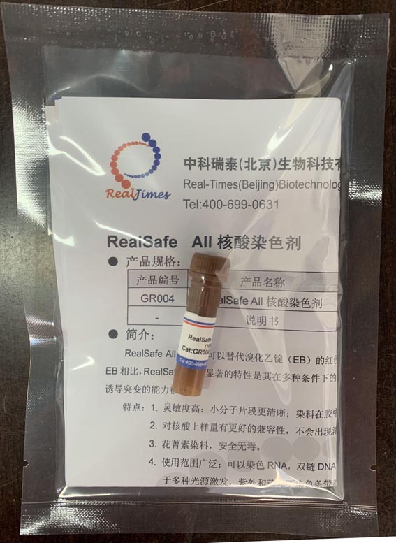 RealSafe All是一種可以替代溴化乙錠(EB)的紅色熒光核酸染色劑,與GelRed是類似產(chǎn)品。與SYBR或EB相比,RealSafe All最顯著的特性是其在多種條件下的高靈敏性和穩(wěn)定性。另外相對EB或SYBR,RealSafe Red誘導(dǎo)突變的能力極低。