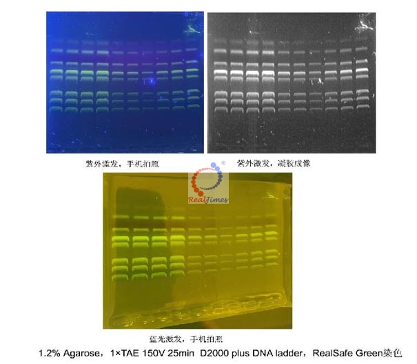 RealSafe?Green是一種可以替代溴化乙錠(EB)的熒光核酸染色劑,屬于花青素類染料。與核酸結(jié)合后,RealSafe Green的熒光激發(fā)波長在280和502nm,最大發(fā)射波長在530nm。與SYBR或EB相比,RealSafe?Green具有以下特點: