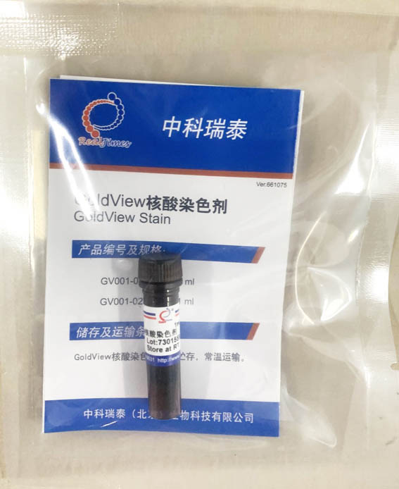 GoldView 是一種可代替溴化乙錠(EB)的新型DNA染料,其靈敏度與EB相當(dāng),使用方法與之完全相同。在紫外燈下雙鏈DNA呈現(xiàn)綠色熒光。通過小鼠皮下注射實(shí)驗(yàn),尚未發(fā)現(xiàn)GoldView有致癌作用。