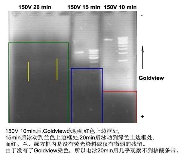 注:預(yù)染法,Goldview染色會(huì)出現(xiàn)陰陽膠現(xiàn)象,即隨著電泳時(shí)間延長,較小的片段會(huì)染色不清楚,(參見實(shí)驗(yàn)示例),此時(shí)可以將凝膠用后染法染色即可看到小片段條帶。