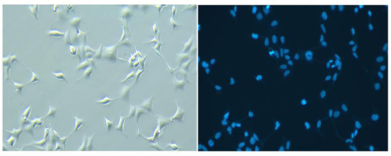 293細(xì)胞消化后調(diào)整密度為1×105/ml;12孔板,每孔接種1 ml,37度培養(yǎng)30小時;加入10 μl Hochest 33342活細(xì)胞染色液(100×);37度培養(yǎng)10分鐘,直接觀察。