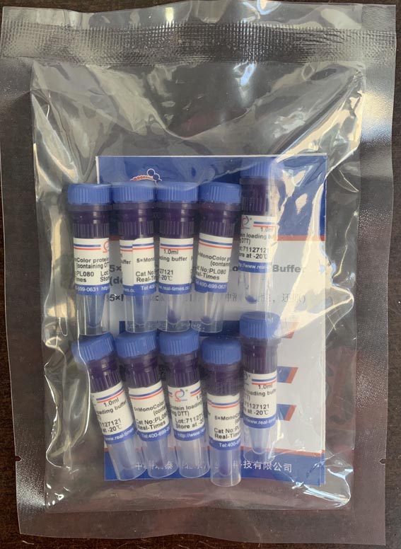 5×SDS-PAGE蛋白上樣緩沖液 (還原)是以溴酚藍(lán)為染料,5倍濃縮的SDS-PAGE凝膠電泳上樣緩沖液,應(yīng)用于還原型SDS-PAGE的蛋白樣品制備和上樣。該緩沖液中含有DTT,可使蛋白質(zhì)分子的鏈內(nèi)二硫鍵和鏈間二硫鍵斷裂,通過(guò)二硫鍵連接的各蛋白亞單位彼此分離,經(jīng)考馬斯亮藍(lán)染色以后在電泳凝膠上顯現(xiàn)清晰蛋白條帶。