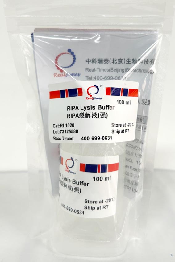 RIPA裂解液(RIPA Lysis Buffer)是一種傳統(tǒng)的細(xì)胞組織快速裂解液。RIPA裂解液裂解得到的蛋白樣品可以用于常規(guī)的Western、IP等。RIPA的本意是Radio Immunoprecipitation Assay。RIPA裂解液的配方有很多種,根據(jù)其裂解液的強(qiáng)度大致可以分為強(qiáng)、中、弱三類。RIPA裂解液(強(qiáng))的主要成分為50 mM Tris (pH 7.4),150 mM NaCl,1% Triton X-100,1% sodium deoxycholate,0.1% SDS,以及sodium orthovanadate,sodium fluoride,EDTA,EGTA等多種抑制劑。可以有效抑制蛋白降解。由于含有較高濃度的Triton X-100等干擾物質(zhì),不能用傳統(tǒng)Bradford法測定由本裂解液裂解得到樣品的蛋白濃度,可以使用BCA蛋白濃度測定試劑盒(貨號:RTP7102)或Bradford蛋白濃度測定試劑盒(去垢劑兼容型)(貨號:RTP7104)測定蛋白濃度。