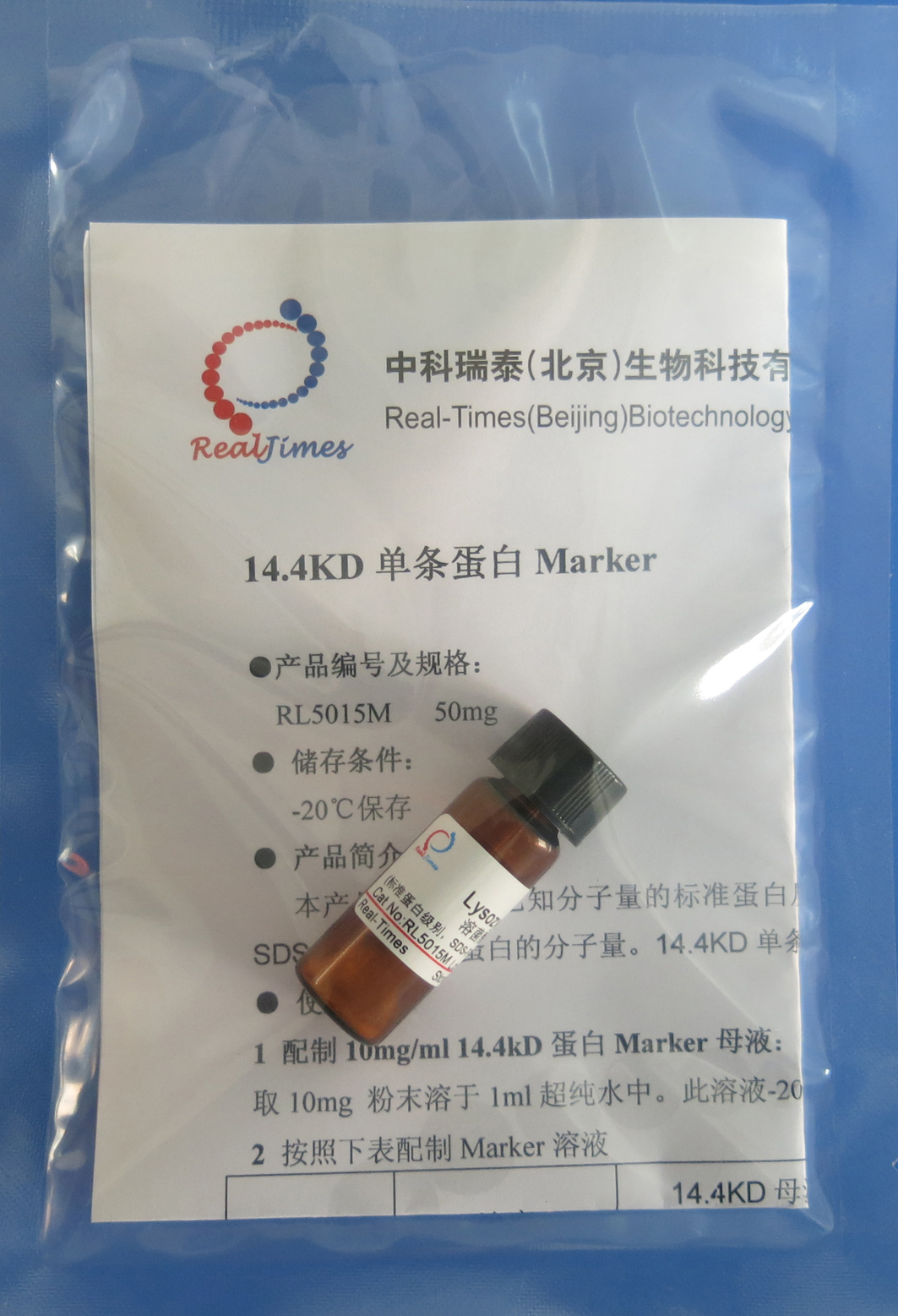 本產(chǎn)品包含一種已知分子量的標(biāo)準(zhǔn)蛋白質(zhì),分子量大小為14.4 kD,可以用來判斷 SDS-PAGE未知蛋白的分子量。14.4KD單條蛋白Marker 以干粉狀態(tài)提供。以每次上樣10 μl(2 μg)計(jì)算,本產(chǎn)品可以使用約25000次。