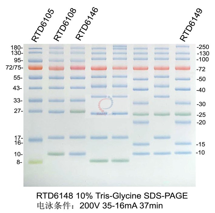 本產(chǎn)品包含10種純化的預(yù)染蛋白質(zhì)組成,分子量范圍為10-180kD,其中70kD條帶為紅色,10kD條帶為綠色,其余條帶為藍(lán)色,可以用于SDS-PAGE和Western Blot轉(zhuǎn)膜時(shí)確定未知蛋白的分子量。