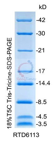 本產(chǎn)品包含8種低分子量蛋白質(zhì),分子量范圍為3.5-42 kD,通過 Tris-Tricine-SDS-PAGE電泳并經(jīng)考馬斯亮藍染色后可見分子量大小為3.5,4.5,8.5,14.4,17,21,30,42