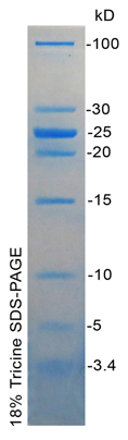 本產(chǎn)品包含5種多肽和3種低分子量蛋白質(zhì)組成,分子量范圍為3.4kD-100kD??梢杂脕砼袛?SDS-PAGE上多肽和小蛋白的分子量。