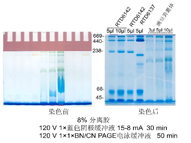 該試劑盒不含樣品制備的相關試劑,根據(jù)樣品種類,具體選擇不同提取方法。植物類囊體BN樣品制備可以選擇植物類囊體膜提取試劑盒(貨號:RTU5002);動物總蛋白BN樣品制備可以選擇動物胞漿活性蛋白提取試劑盒(不含去垢劑,離心柱法)(貨號:RTD8106);動物膜蛋白BN樣品制備可以選擇動物膜蛋白提取試劑盒(細胞)(貨號:RTD8111)和動物膜蛋白提取試劑盒(組織)(貨號:RTD8112);動物線粒體BN樣品制備可以選擇動物細胞線粒體提取試劑盒(貨號:RTD8115)和動物組織線粒體提取試劑盒(貨號:RTD8117)。