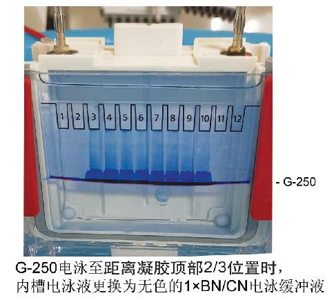 BN-PAGE電泳外槽使用1×BN/CN電泳緩沖液;內槽開始電泳使用的是1×藍色陰極緩沖液,冰浴電泳,等待電泳指示前沿到達距離凝膠頂部2/3處時,將電泳緩沖液更換為1×BN/CN電泳緩沖液,繼續(xù)后續(xù)電泳,因為過多染料會影響蛋白在凝膠中的遷移以及蛋白后續(xù)的轉膜實驗。