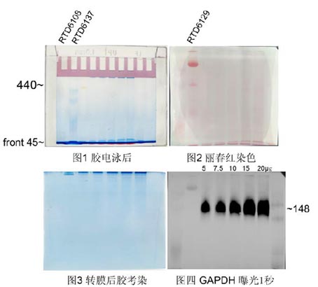 (貨號:RTD6202)幾乎無條帶,證明轉膜成功。膜用無水甲醇清洗5分鐘去除膜上藍色殘余。