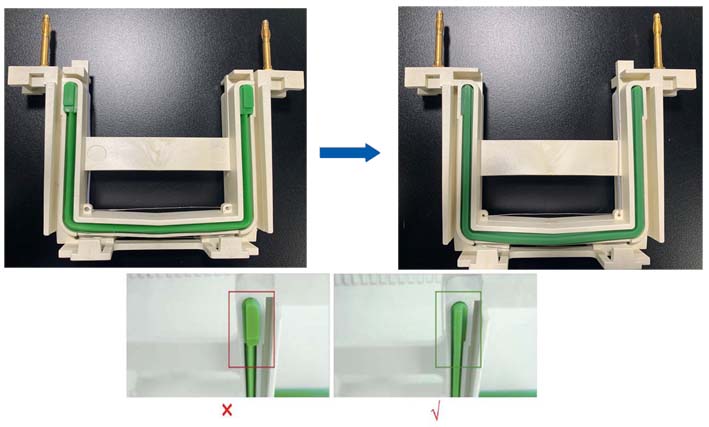 注:伯樂Mini IIIMini-PROTEAN Tetra Cell,天能VE-180,六一24K系列電泳槽請確保密封條的安裝方向(如圖)。