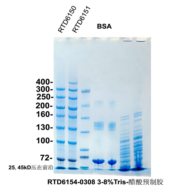 Tris-醋酸-SDS-PAGE凝膠電泳適合于分離高分子量蛋白,可以有效分離50-500 kD范圍內(nèi)蛋白;電泳體系呈中性,抑制半胱氨酸的二次氧化,防止二硫鍵在凝膠中交聯(lián);在變性還原電泳中,電泳緩沖體系中加入抗氧化劑,整個電泳過程都在還原條件下進(jìn)行,有效防止二硫鍵的形成。