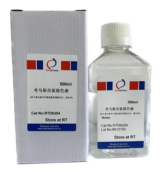 Blue Staining Destaining Solution)是用于蛋白凝膠考馬斯亮藍(lán)染色后凝膠的脫色。本脫色液可以和考馬斯亮藍(lán)染色液(RTD6203)配套使用。使用本脫色液進(jìn)行脫色,采用常規(guī)脫色方法至少脫色1小時可以觀察到蛋白條帶;采用快速脫色方法不足20分鐘即可觀察到蛋白條帶。觀察到最清晰的蛋白條帶則需脫色更長時間。
