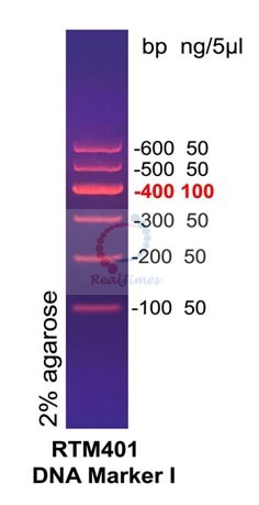 本產(chǎn)品是由6條帶狀雙鏈DNA條帶組成,適用于瓊脂糖凝膠電泳中DNA條帶的分析。產(chǎn)品中已含有1×loading buffer,可根據(jù)實驗需要,直接取2-5μl電泳,使用方便,電泳圖像清晰。6條帶的大小和含量分別為100(50 ng/5 μl),200(50 ng/μl),300(50 ng/μl),400100 ng/μl,500(50 ng/μl),600(50 ng/μl) bp。其中400bp條帶加亮顯示。