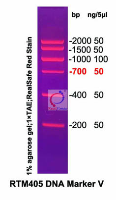 本產(chǎn)品是由6條帶狀雙鏈DNA條帶組成,適用于瓊脂糖凝膠電泳中DNA條帶的分析。產(chǎn)品中已含有1×loading buffer,可根據(jù)實驗需要,直接取2-5μl電泳,使用方便,電泳圖像清晰。6條帶的大小分別為200,400,700,1000,1500,2000bp。其中1000bp條帶含量為100ng/5μl,顯示加亮帶,其余條帶含量為50ng/5μl。