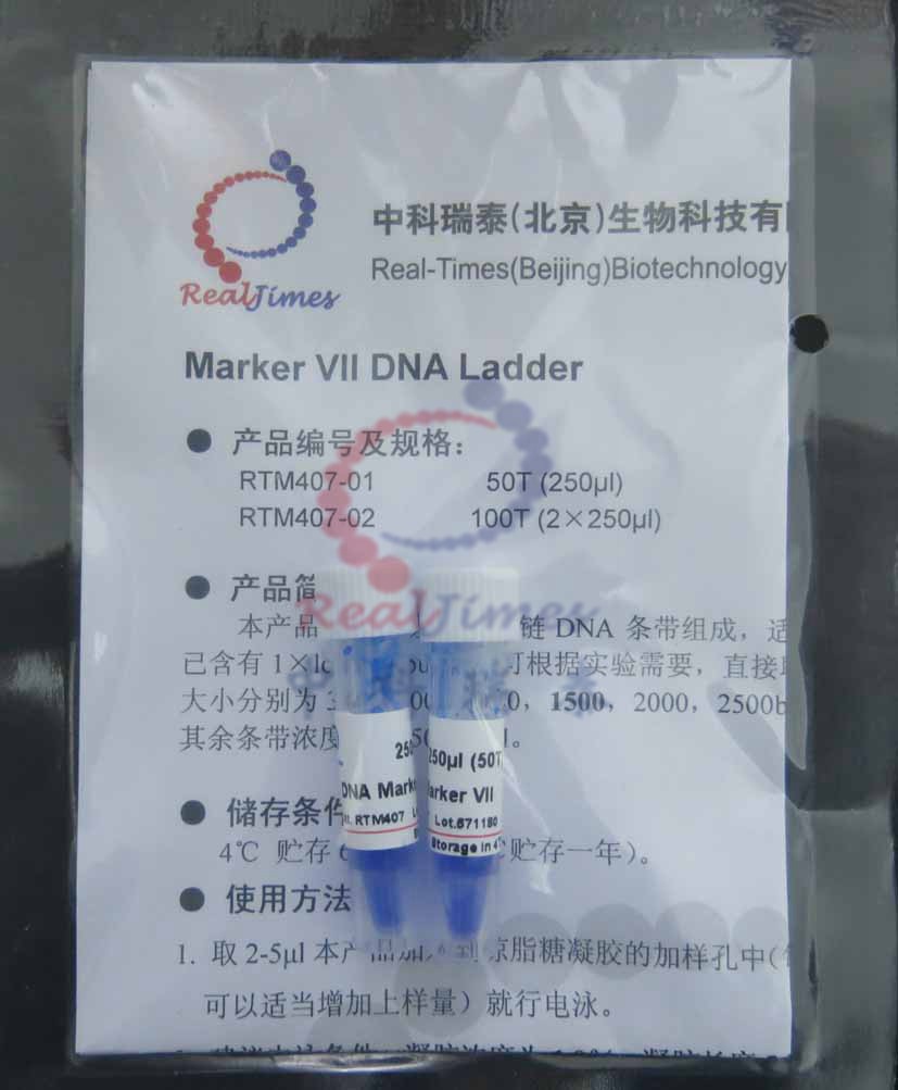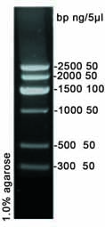 本產(chǎn)品是由6條帶狀雙鏈DNA條帶組成,適用于瓊脂糖凝膠電泳中DNA條帶的分析。產(chǎn)品中已含有1×loading buffer,可根據(jù)實(shí)驗(yàn)需要,直接取2-5μl電泳,使用方便,電泳圖像清晰。6條帶的大小分別為300,500,1000,1500,20002500bp。其中1500bp條帶約為100ng/5μl,顯示加亮帶,其余條帶濃度大約50ng/5μl