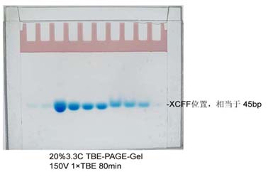 DNA loading buffer,如10 μl樣品加2 μl 上樣緩沖液,短暫離心后取5-10 μl上樣。 20bp DNA ladder 1 mm厚10齒梳子上樣5 μl,其余梳齒和厚度凝膠適量調(diào)整上樣量。