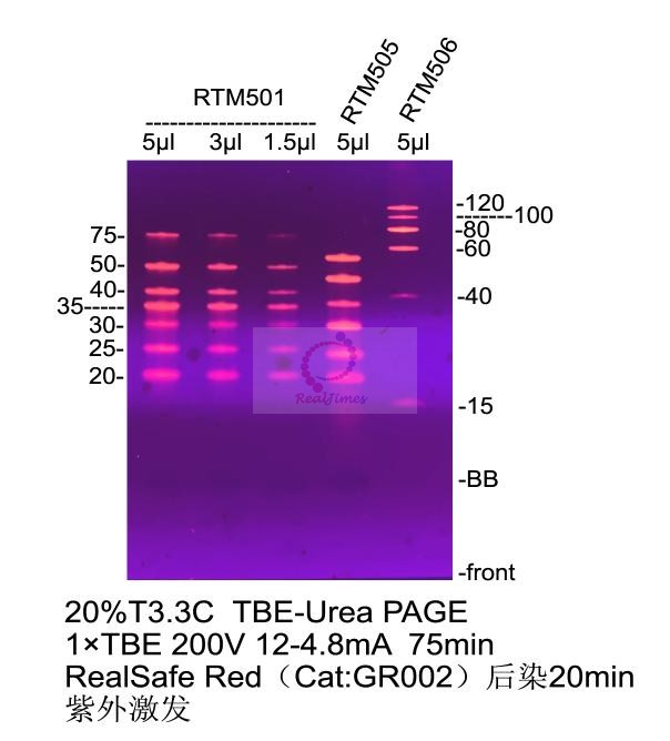 PAGE電泳染色試劑盒(Cat:RTS5103),核酸PAGE電泳染色試劑盒(Cat:RTS5102),核酸快速高靈敏度染色試劑盒(Cat:RTS5101)或核酸染料如RealSafe