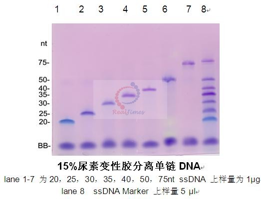 單鏈DNA Marker由不同長(zhǎng)度的單鏈DNA分子混合而成,7條帶的大小為20,25,30,35,40,