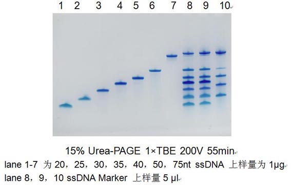 注:1. 染色時(shí)間不要太長(zhǎng),更不能過(guò)夜染色。長(zhǎng)時(shí)間染色會(huì)導(dǎo)致ssDNA游離出凝膠,導(dǎo)致膠上無(wú)帶。