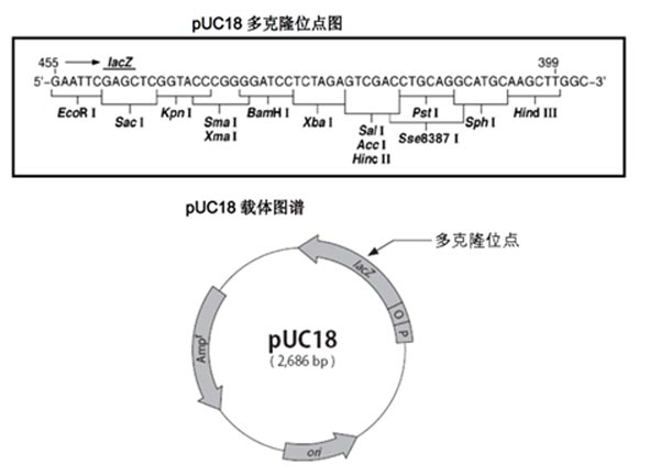 pUC18 載體適用于雙脫氧法對(duì)DNA 片段進(jìn)行測(cè)序,它克隆的 DNA 片段比使用 M13 phage作載體時(shí)克隆的片段長。 由于在 lacZ 領(lǐng)域中含有多克隆位點(diǎn), 因此可以在含有 IPTG、 X-Gal的平板培養(yǎng)基上通過藍(lán)白篩選判斷載體中有無 DNA 片段的插入。同時(shí)還可以通過載體上的lac promoter表達(dá)外源基因, 使用M13系列的通用引物對(duì)插入載體中的DNA片段進(jìn)行測(cè)序。
